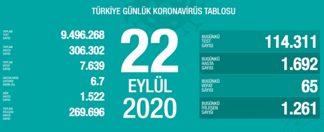 22 Eylül itibarıyla, 24 saatte 114 bin 311 Kovid-19 testi yapıldı, 1692 kişiye hastalık tanısı konuldu, 65 kişi Kovid-19 nedeniyle hayatını kaybetti, ağır hasta sayısı 1522 oldu. Sağlık Bakanı Fahrettin Koca zatürre oranında düşüşün devam ettiğini söyledi.