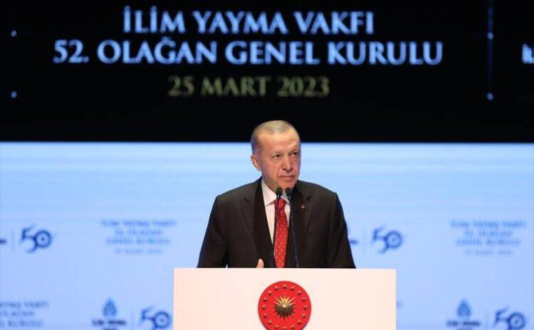 İlim Yayma Vakfı’nın 50’nci kuruluş yıl dönümünün hayırlara vesile olmasını dileyerek konuşmasına başlayan Cumhurbaşkanı Erdoğan, “Tüm ilim yayma camiasının bugün üçüncü gününü idrak ettiğimiz Ramazan-ı Şerifi’ni tebrik ediyorum. Bu mübarek ayın milletimizle birlikte tüm İslam dünyasına tüm insanlığa huzur ve esenlik getirmesini diliyorum. Bu sene milletçe bir tarafta 11 ayın sultanı Ramazan’a ulaşmanın sevincini diğer tarafta deprem felaketinde 50 bini aşkın canımızı yitirmenin hüznünüz yaşıyoruz. Ülkemizin 11 vilayetindeki 14 milyon vatandaşımızın hayatını alt üst eden depremler sadece afetzedelerimizin değil 85 milyonun hepsinin yüreğine kor ateş gibi düştü. Nasıl bedeninin bir uzvu hastalanınca diğerleri huzursuzlanırsa, deprem bölgesindeki kayıplarımızın acısını da hepimiz derinden hissediyoruz. Bu sıkıntılı günlerde Ramazanı Şerif’in gönülleri yumuşatan, kardeşliği hatırlatan iklimine daha çok ihtiyaç duyuyoruz. Cumhur İttifakı’ndaki ortaklarımızla beraber dün ve önceki gün Kahramanmaraş ve Hatay’ı tekrar ziyaret ettik. Hem deprem konutlarının temelini attık hem de iftarımızı afetzede kardeşlerimizle açtık. Maraşlı ve Hataylı vatandaşlarımızın hayata yeniden tutunma azmine bizzat şahit olduk. Temelini attığımız konut projelerinin yeşeren umutları daha da güçlendireceğine inanıyorum. Deprem bölgesinde yaşayan kardeşlerimiz özellikle bu Ramazanı Şerif’te bizden daha fazla anlayış göstermemizi bekliyor. Hepimizin depremzedelerimizin yanında olması, zor günlerinde onları yalnız bırakmaması gerekiyor. İlim Yayma Vakfı’mızın deprem anından itibaren sergilediği dayanışmayı Ramazan ayında artırarak devam ettirdiğini görüyorum. Temel ihtiyaç maddelerinin temininden, konteyner kurulumuna, iftar ve sahur sofralarından öğrencilerimize yönelik barınma ve burs imkanlarına kadar geniş bir yelpazede yaptığınız çalışmaları takdirle karşılıyorum” şeklinde konuştu.