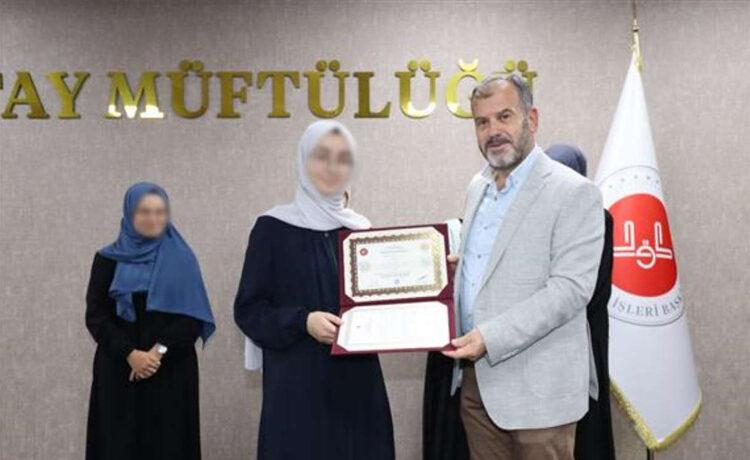 Konya Karatay İlçe Müftülüğü Konferans Salonu'nda hafızlık sınavında başarılı olan öğrencilere diplomaları verildi. Törende çekilen fotoğraflarda diploma ve plaket alan kadınların yüzleri buzlandı.
