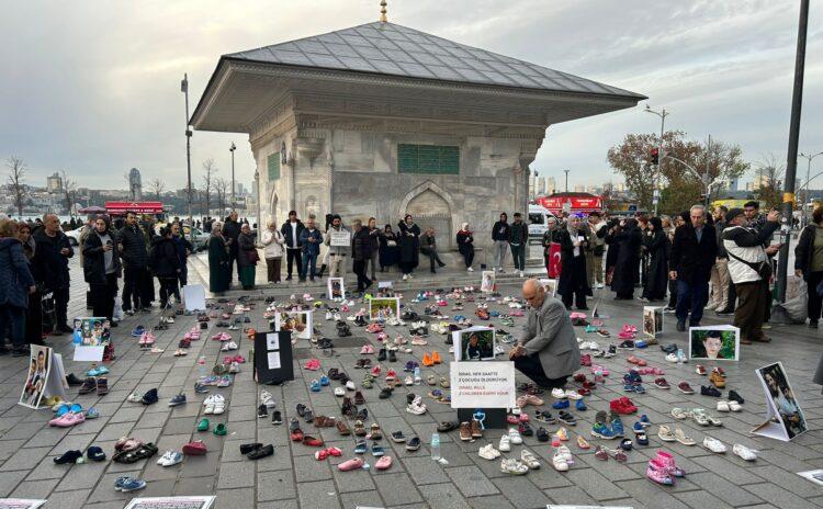 Üsküdar Mihrimah Sultan Camii önünde bir araya gelen Filistin İnisiyatifi grubu üyeleri ‘Filistinli Çocuklar İçin Yürü’ sloganıyla eylem yaptı. III. Ahmet Çeşmesi önüne İsrail’in katlettiği çocukları temsilen 500’e yakın 0-5 yaş arası çocuk ayakkabısı bırakan grup, ayakkabıların yanına İsrail’in Gazze’ye yönelik saldırıları sonucu hayatlarını kaybeden çocuklardan bazılarının fotoğraflarıyla ‘İsrail her saatte 5 çocuğu öldürüyor’ yazılı döviz bıraktı. ‘Filistinli çocukların ömrü bu kadarını yürümeye yetti. Çünkü işgalci İsrail onları katletti. Yolun bundan sonrasını onlar için sen yürü’ yazılarının bulunduğu kağıtlar yerlere yapıştırıldı.