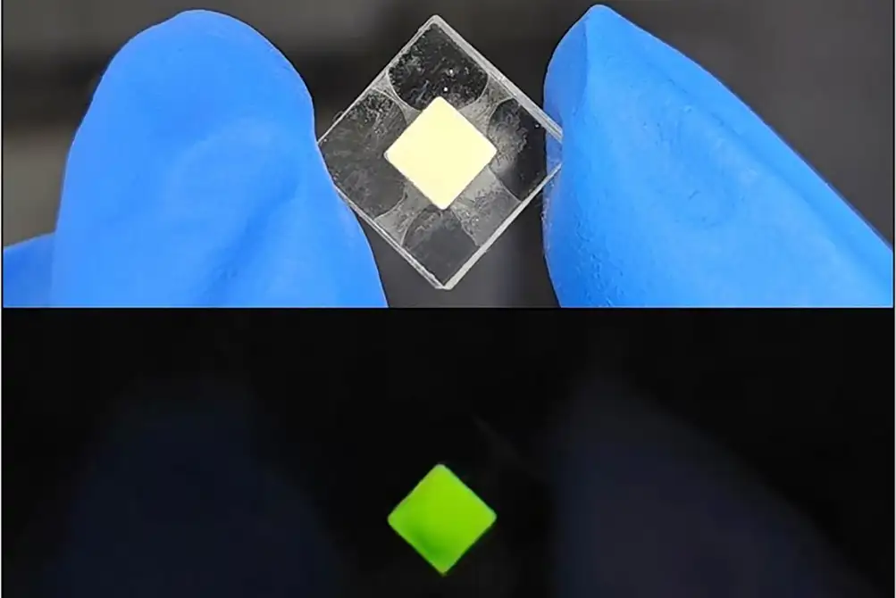 Üstte amerikyumun konduğu kristal, altta karanlıkta parlayışı.