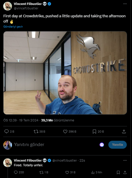 Durumla dalga geçenler de yok değildi. Örneğin Vincent Flibustier adındaki bu X kullanıcısı “Crowdstrike’taki ilk günüm, biraz güncelleme yapıp öğle sonunu tatil ilan ettim” diye yazdı. Bu tweetinden iki saat sonra da “Kovuldum” diye yazdı. Bu kişi tabii ki dalga amaçlı bunu yazdı ama tweete inanıp tepki gösterenler de olmadı değil.