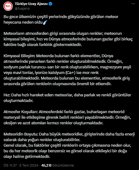 Bize meteorlarla ilgili çok genel bilgiler verdiği için TUA’ya teşekkür ederiz. Yoksa bu bilgilere nereden ulaşacaktık, Google’daki herhangi bir bilim sayfasında bu bilgiler olacak değil ya!