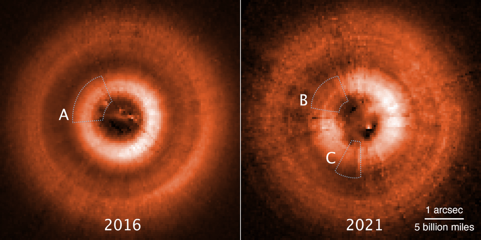 2016’daki disk (solda), sağ altta daha parlak ve sol üstte daha karanlık bir alana sahip, bu da bir gölgeye işaret ediyor. 2021 gözleminde (sağda) ise sol altta ve sol üstte iki tane karaltı görünüyor. Fotoğraf: NASA