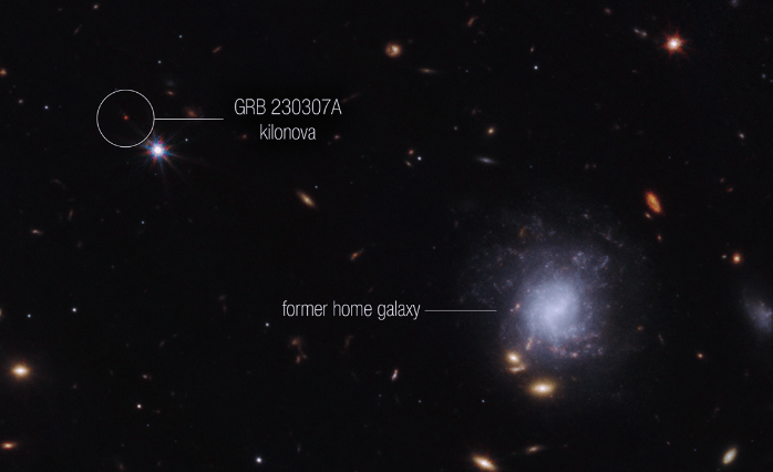 Büyük bir yıldızın çekirdeğinin çökmesi ya da iki nötron yıldızının çarpışması sonucu gama ışını patlaması ortaya çıkar ve bu saniyelerle dakikalar arasında süren bir olaydır. Bizim şimdi ele alacağımız 200 saniye süren patlama ise GRB 230307A. Bu yıl mart ayında James Webb Uzay Teleskobu tarafından gözlemlenen bu patlamanın gerçekleşebilmesi için iki nötron yıldızı birbirinin etrafında spiral çizerek birkaç milyar yıl geçirmiş. Bu patlamanın şimdiye kadar gözlemlenen en parlak gama ışını patlamalarından biri olduğunu da hatırlatalım. Hatta öyle parlaktı ki Samanyolu Galaksisi’nin tamamından bir milyon kat daha parlaktı.