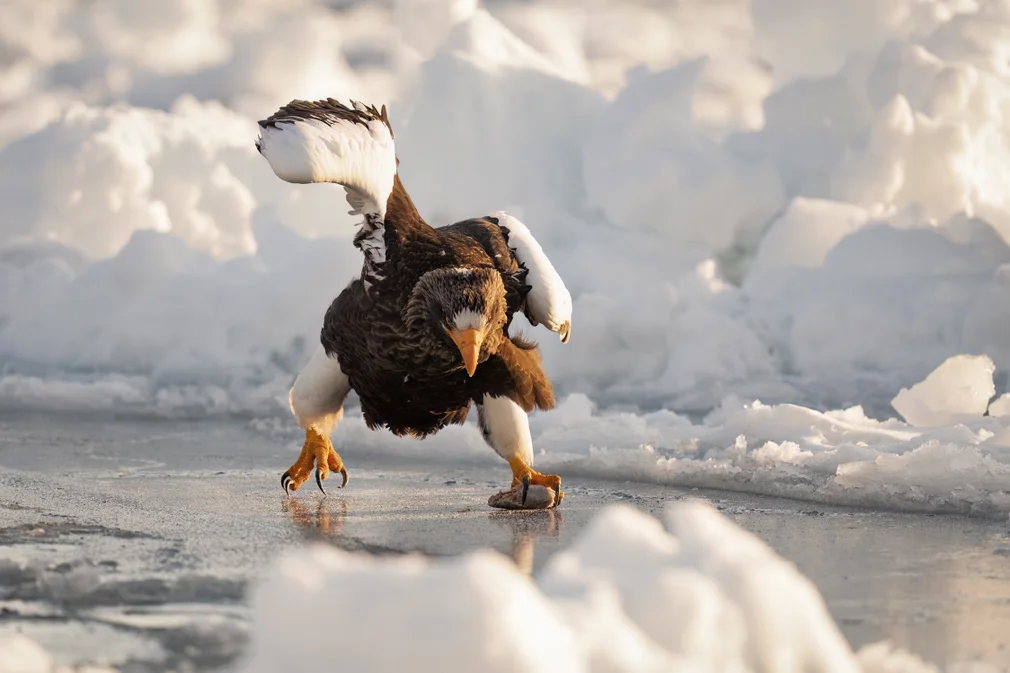 Ya da şu Japonya’nın Hokkaido açıklarında mahalle kavgasına gider gibi deniz buzunda koşan Steller deniz kartalına…