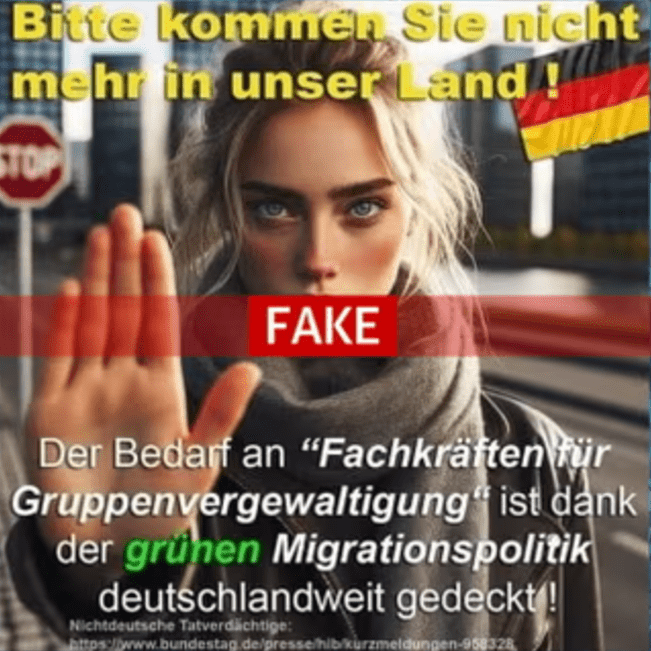 Mesela Almanya’da AfD’nin yaptığı görsellerden birinde sarı saçlı, mavi gözlü bir kadın eliyle dur işareti yapıyor. Arkasında da anlaşılmazsa diye dur işareti var, diğer tarafta da Almanya bayrağı görülüyor. Görselin üstünde göçmenlerin Almanya’ya gelmekten vazgeçmesi gerektiği yazıyor. Sebep olarak da Yeşiller partisinin göç politikası nedeniyle daha fazla “toplu tecavüz uzmanı”na ihtiyaçları olmadığı yazıyor.