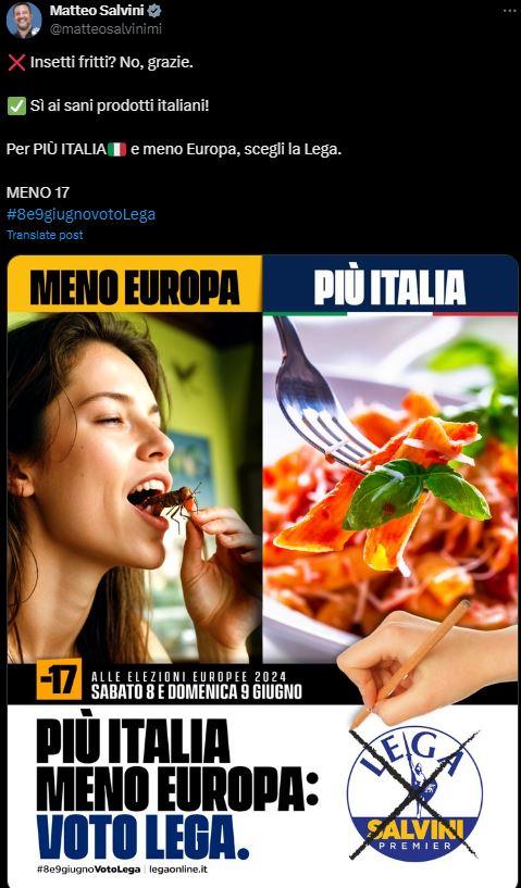 “Bunların yapay zeka ürünü olduğu anlaşılıyor ama” diyebilirsiniz. İtalya’da milliyetçi Lega partisi Avrupa Birliği (AB) karşıtlığını göstermek için çok daha gerçekçi yapay zeka fotoğrafları kullanıyor. Mesela Lega’nın lideri Matteo Salvini sosyal medya hesaplarında AB’nin Avrupalıları böcekle beslenmeye hazırladığını iddia ettiği komplo teorilerini desteklemek için aşağıdaki gibi afişler paylaşıyor.