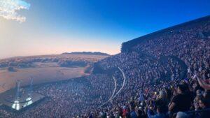 Sphere’in içinde konser izlemek benzersiz bir deneyim… İşte U2’nun kullandığı sahnelerden biri… Onlar çölde söylüyor, siz Sphere’de koltuğunuzda dinliyorsunuz.