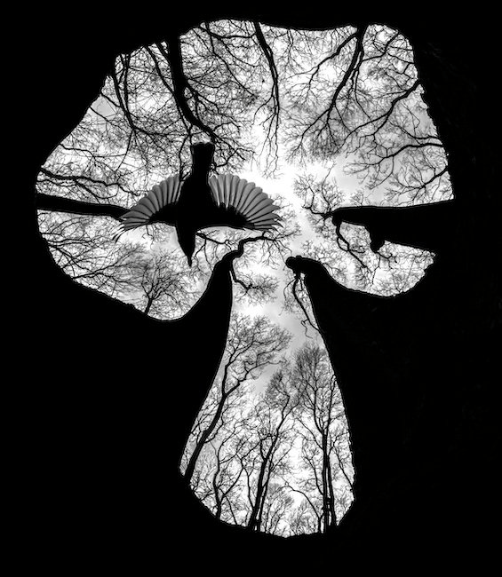 Bu yılın büyük ödülü ise Macar fotoğrafçı Csaba Daróczi’nin ormanda süzülen sıvacı kuşunu çektiği siyah beyaz fotoğrafa gitti. Oyulmuş bir ağaç kütüğünün içinden GoPro 11 ile çekilen bu görüntüde yukarı doğru uzanan ağaçlar sanki insan figürü oluşturuyor. Aynı zamanda çekim açısı sağ olsun ağaçlar uzaktan bakılınca devasa bir mantara benziyor. Daróczi geçen yıl kışı, yaşadığı yerin yakınlarındaki ormanda fotoğraf çekerek geçirmiş. Sonra bu ağaçlarla çevrili yeri keşfetmiş. Önce kuşun geçmediği, sadece ağaçların olduğu bir fotoğraf çekmiş ama sonra bir hayvanın fotoğrafı daha da güzelleştireceğine karar vermiş. Oyuğun yakınına ayçiçeği yerleştirmiş, böylelikle farelerle kuşları buraya çekebilmiş. Bizce gayet iyi bir iş çıkarmış.