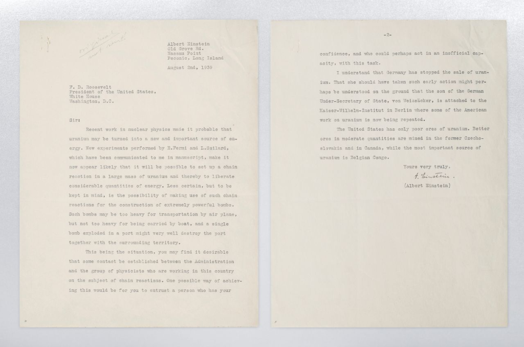 1939 yazı. Avrupa’da savaş giderek yaklaşırken ABD’li birkaç bilim insanı Einstein’dan dönemin ABD Başkanı Franklin D. Roosevelt’i Almanya’nın atom bombasının icadına yaklaştığı konusunda uyarmasını istedi. Kendisini “pasifist” olarak gören Einstein işe koyulmakta gecikmedi.