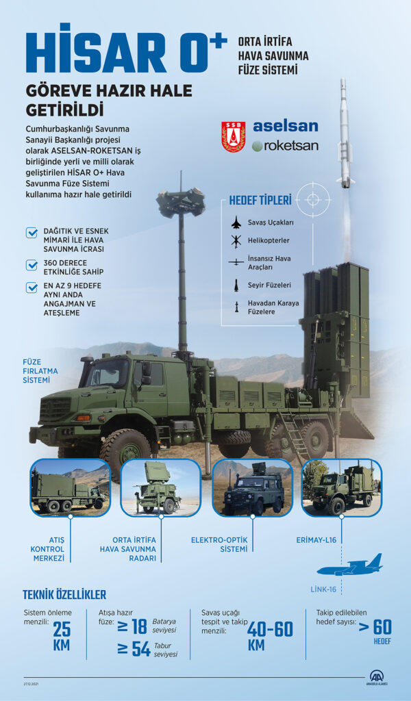 Cumhurbaşkanlığı Savunma Sanayii Başkanlığı projesi olarak ASELSAN-ROKETSAN iş birliğinde yerli ve milli olarak geliştirilen HİSAR O+ Hava Savunma Füze Sistemi kullanıma hazır hale getirildi.