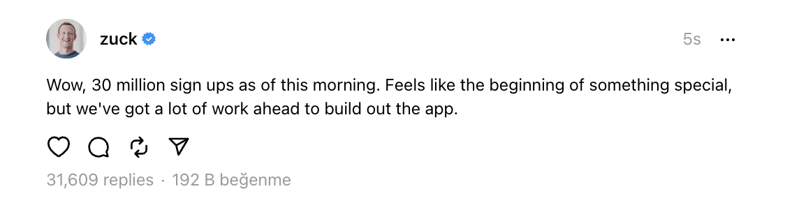 Twitter’ın klonu denecek kadar benzeri, en fazla 500 karakter uzunluğunda gönderi oluşturmanıza, beş dakikaya kadar uzunlukta video veya fotoğraf paylaşmanıza imkân veriyor. Threads’te şu anda reklam yok. Ama tabii ki her ticari ürün gibi ileride gelmesi muhtemel. Kurduğu yeni platformda sosyal medyayı hatırlayan Mark Zuckerberg 11 yıl sonra Twitter’da bir Tweet paylaştı ve Threads-Twitter benzerliğinden bahsetti: