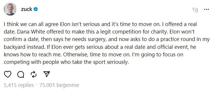 Zuckerberg pazar günü piyasaya yeni sürdüğü Threads uygulaması üzerinden yaptığı paylaşımda, “Sanırım hepimiz Elon’ın ciddi olmadığı konusunda hemfikiriz, artık önümüze bakmanın zamanı geldi. Gerçek bir dövüş tarihi teklif ettim. Ultimate Fighting Championship Başkanı Dana White, bunu hayır amaçlı bir yarışma haline getirmeyi kabul etti. Elon ise tarihleri onaylamıyor, sonra ameliyat olması gerektiğini söylüyor ve şimdi de gelmiş benim arka bahçemde ısınma turu yapmak istiyor” diyerek Elon’ın dövüşmekteki kararlılığını sorguladı.