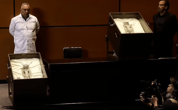 Meksika Kongresi'nde salı günü ilginç bir oturum gerçekleşti. 1000 yıllık mumyalanmış iki ceset sergilendi ve bu cesetlerin DNA'larının yüzde 30'unun bilinmediği belirtilirken, birinde nadir metallere rastlandı. Ancak iddiaları dile getiren Meksikalı gazetecinin şaibeli olduğu söyleniyor.