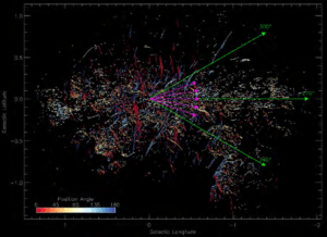 Tüm filamentlerin yönelimlerini gösteren MeerKAT verileri. Fotoğraf: Farhad Yusef-Zadeh/Northwestern Üniversitesi Northwestern Üniversitesi’nden Farhad Yusef-Zadeh, 1980’lerin başında galaksimizin kalbindeki süper kütleli kara delik Sagittarius A*’nın yakınında dikey halde asılı duran tek boyutlu devasa filamentler tespit etmişti.