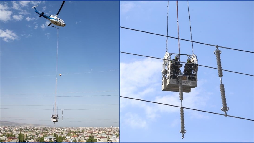 Türkiye Elektrik İletim AŞ (TEİAŞ) canlı bakım ekibi Van'da halatla helikoptere bağlanan çelik sepetin içinde metrelerce yükseklikteki enerji hattında "interfaz ara tutucu" montajı yaparken görüntülendi.