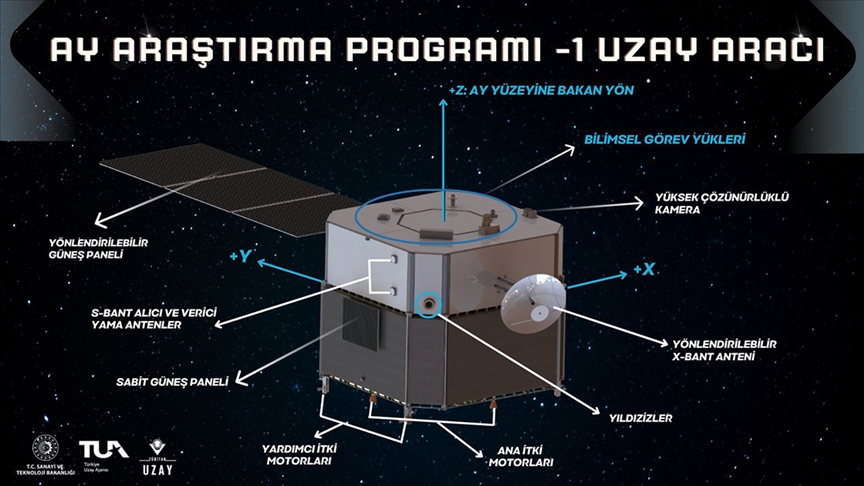 Türkiye Uzay Ajansının (TUA) hazırladığı Milli Uzay Programı içinde yer alan “Ay Araştırma Programı-1 (AYAP-1)” için tasarlanan uzay aracına ait ilk detaylar paylaşıldı. TUA’nın sosyal medya hesabından uzay aracı görselinin yer aldığı paylaşımda, yönlendirilebilir güneş paneli, S-Bant alıcı ve verici yama antenler, sabit güneş paneli, yardımcı itki motorları, ana itki motorları, yıldızizler, yönlendirilebilir X-Bant anteni, yüksek çözünürlüklü kamera gibi bileşenler gösterildi. TÜBİTAK Uzay Teknolojileri Araştırma Enstitüsü (TÜBİTAK UZAY) tarafından tasarlanan uzay aracı iki ayrı modülden oluşacak. Platform modülü, hem Ay’a ulaşmak için gereken ateşlemelerin yapılması hem de Ay’a ulaştıktan sonra gerçekleştirilecek seyrüsefer, görüntüleme ve bilimsel veri toplama gibi görevlerin yerine getirilmesi için gereken çeşitli alt sistemleri barındırıyor. Bunlar, uzay aracı veri kotarma, haberleşme, güç ve yönelim ve yörünge kontrol alt sistemlerinden oluşuyor. Tüm bu alt sistemlerle aracın uçuş ve komuta kontrol yazılımları TÜBİTAK UZAY tarafından geliştiriliyor.