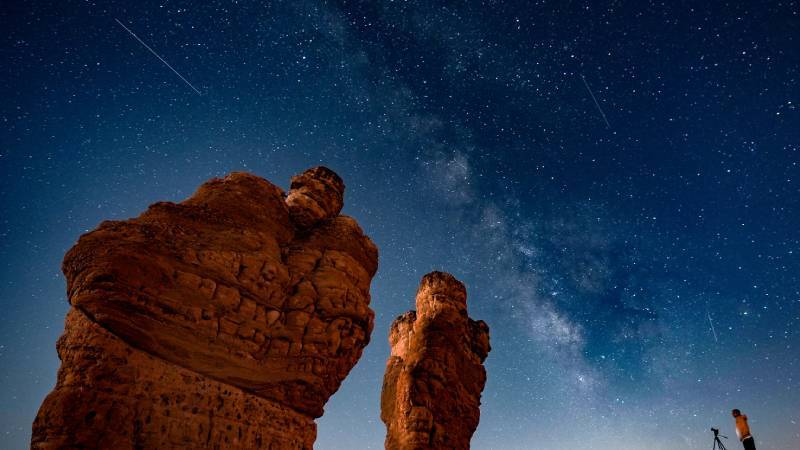 Konya’nın Cihanbeyli ilçesi Kuşça Mahallesi sınırları içerisinde yer alan Kuşça Peribacaları’nda da gece saatlerinde gökyüzünde gerçekleşen meteor yağmuru, uzun pozlama tekniğiyle görüntülendi.
