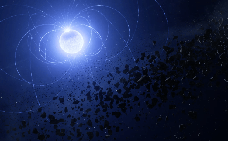Bir sanatçının izleniminden ölü beyaz cüce ile genellikle görünmez olmakla birlikte yıldızın etrafında ilmek ilmek gösterilen manyetik alan. Fotoğraf: L. Calçada/ESO Gökbilimciler ölü bir yıldızın yörüngesindeki gezegenlerden birinin parçasıyla beslendiğine dair alışılmadık bir işaret tespit etti: Yıldızın yüzeyinde metal bir yara izi vardı. Bilim insanları bu keşfin bir yıldızın yaşam döngüsünün son aşamalarında bile gezegen sistemlerinin dinamik doğasına ışık tuttuğunu söylüyor.