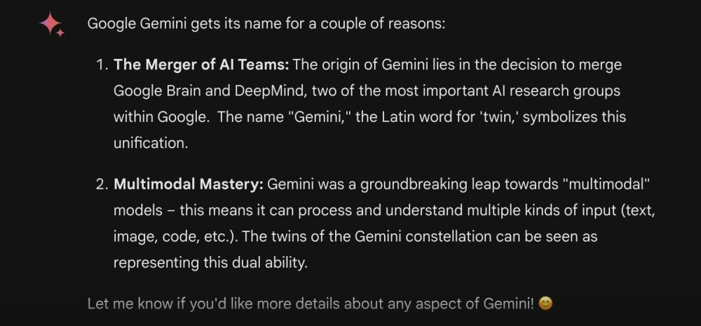 Bir başka sebep de Gemini’ın “çok modlu” modellere doğru atılmış bir adım olması. Bu, birden fazla türde girdiyi (metin, resim, kod vb.) işleyebilme ve anlayabilme anlamına geliyor. Gemini takımyıldızındaki ikizler, bu çift yeteneği temsil ediyor.