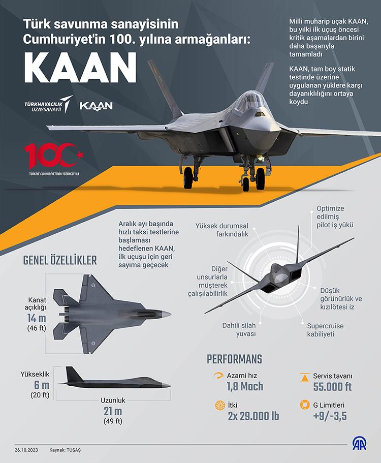 Tasarım ve imalatıyla milli olan Kaan’ın kanat açıklığı 14, yüksekliği 6, uzunluğu ise 21 metre. Kokpiti ise tek kişilik. Çift motoru, yüksek manevra kabiliyeti, radara düşük görünürlüğü, gövde içi silah taşıyabilmesi ve elektronik harp kabiliyeti de Kaan’ın dikkat çeken özelliklerinden.