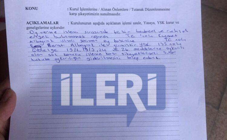 “Oy verme işlemi sırasında hiçbir bedensel ve ruhsal engeli bulunmamasına rağmen, Kıymet Albayrak isimli seçmen oy kabinine Berat Albayrak ile girmiştir. YSK 135 no’lu genelge 19/2, 19/3, 24. ve 26. Maddelerine aykırı olan söz konusu işleme karşı şikayetlerimizi sunar, hukuka aykırılığın giderilmesini talep ederiz.”