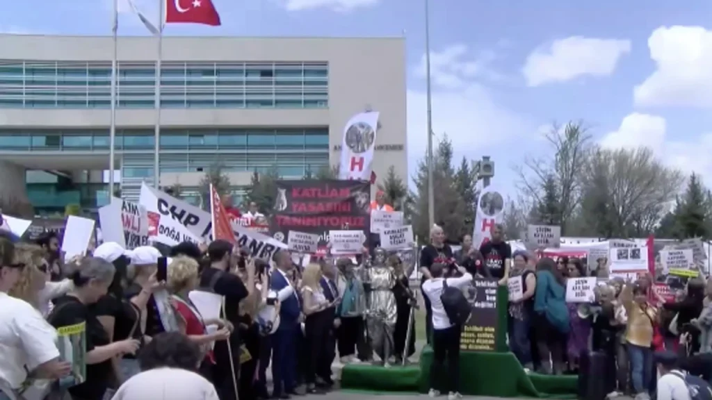 Sabah saatlerinden bu yana AYM önünde bekleyen hayvan hakları savunucuları kararı protesto etti. AYM’nin ana giriş kapısına geçmek isteyen kitleye polis müdahale etti, göstericilerle polisler arasında arbede yaşandı. Hayvan hakları savunucuları, bir süre AYM önünde oturma eylemi yaptı.