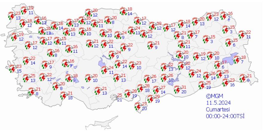 MGM’nin 11 Mayıs Cumartesi günü hava durumu raporu.