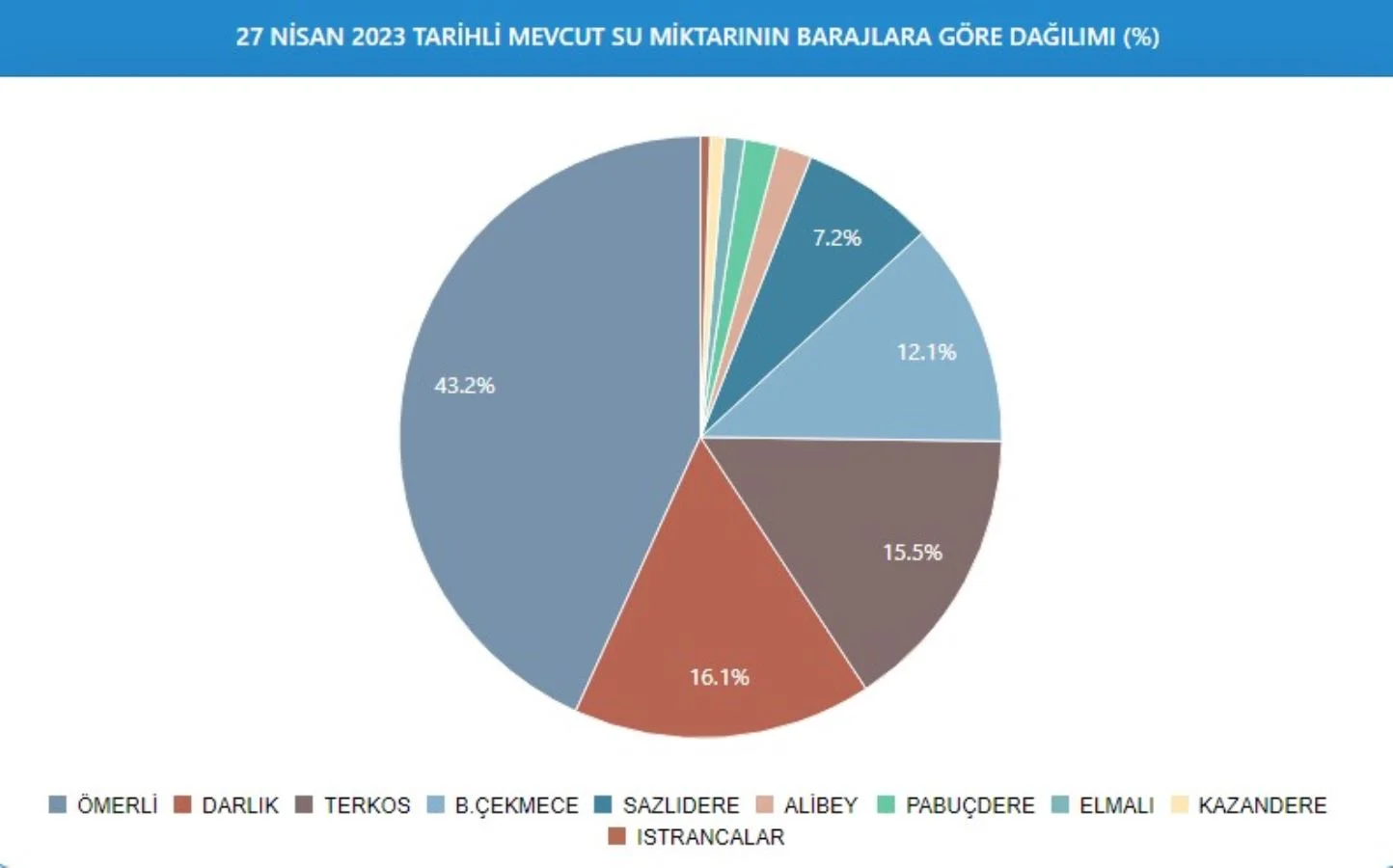 27 Nisan 2023 tarihi itibariyle İstanbul’daki barajların doluluk oranı (%) şöyle:
