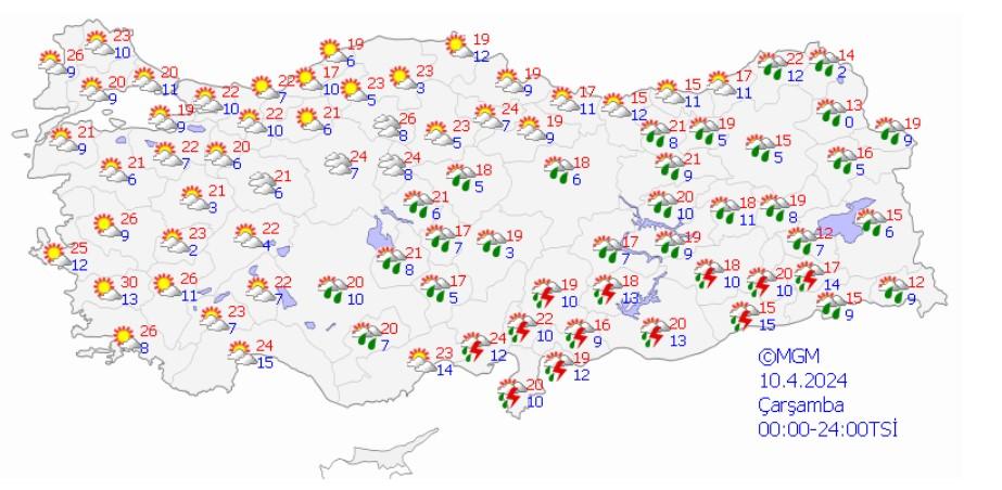“Ankara; genellikle parçalı bulutlu, Cuma günü çok bulutlu, sağanak ve gök gürültülü sağanak yağışlı, günün en yüksek sıcaklığı 17-25 derece arasında olacak. İstanbul; genellikle parçalı bulutlu, Pazar günü çok bulutlu, sağanak ve gök gürültülü sağanak yağışlı, günün en yüksek sıcaklığı 18-24 derece arasında gerçekleşecek. İzmir; genellikle parçalı bulutlu, Pazar günü çok bulutlu, iç kesimleri sağanak ve gök gürültülü sağanak yağışlı, günün en yüksek sıcaklığı 23-27 derece arasında olacak.”