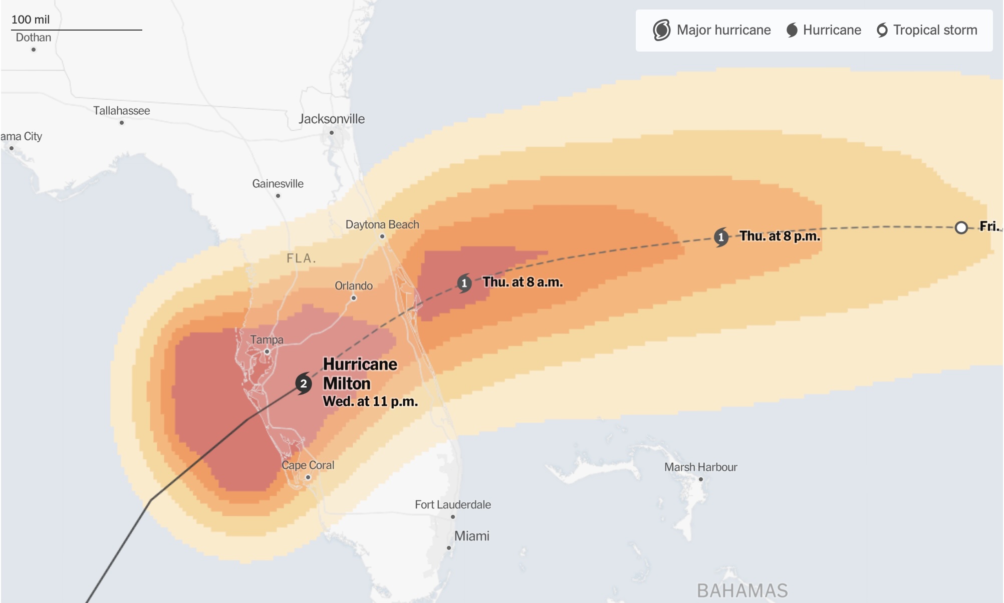 Milton Kasırgası şimdiden Florida’nın büyük şehirlerini vurdu bile. Yukarıda The New York Times gazetesinin yayınladığı son kasırga haritası var.