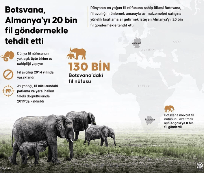 Afrika ülkesi Botsvana, fil avcılığının yasaklanmasından şikayetçi; çünkü fillerin sayısı çok arttı. Ama Almanya başta Batı ülkeleri, fil avcılığı hatıralarının ithalini bile yasaklıyor. Botsvana lideri, 'Almanya'ya 20 bin fil göndeririz' diyor.