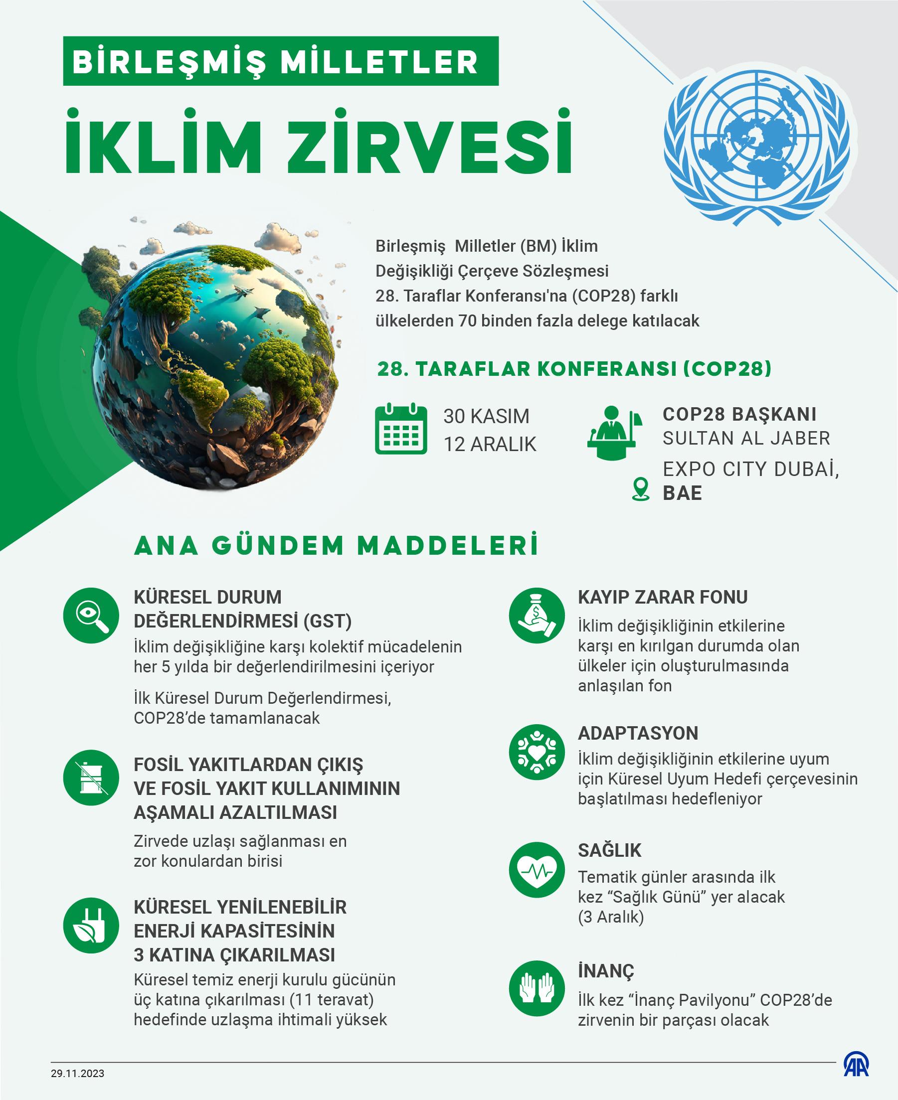 Bu yılki zirve Birleşik Arap Emirlikleri’nin Dubai kentinde düzenleniyor. Zirve bugün başlasa da dünya liderleri 1 ve 2 Aralık tarihlerinde bir araya gelecek. Zirveye karbon salımının şampiyonu Çin ve ABD’nin liderleri Şi Cinping ve Joe Biden katılmıyor. Zirveye katılmayı dört gözle bekleyen ve katılsaydı bunu yapan ilk papa olacak Papa Francis de sağlık sorunları nedeniyle son dakika katılmama kararı aldı.