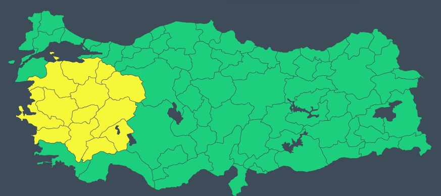 Rüzgarın yarın öğleden sonra İç Ege, Marmara’nın güneyi, Göller Yöresi ile Eskişehir çevrelerinde batı ve güneybatı yönlerden kuvvetli ve kısa süreli fırtına şeklinde (50-70 km/saat, kısa süreli 80 km/saat) esmesi bekleniyor. MGM ayrıca rüzgarın etkili olacağı bu iller için sarı kodlu uyarı yayınladı.
