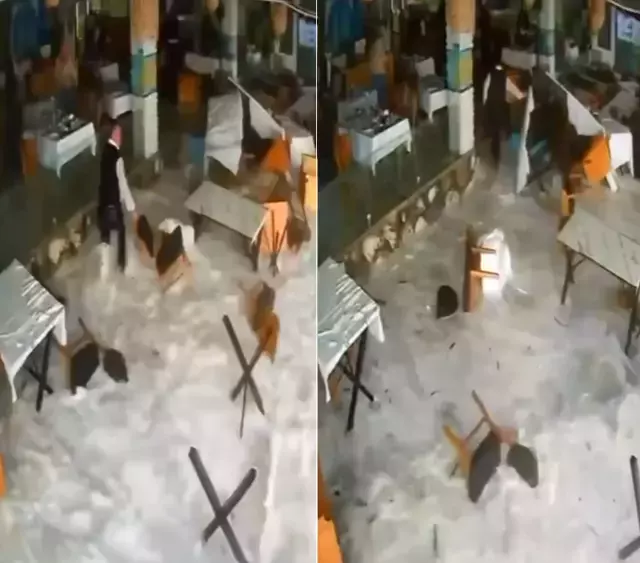 Temizlik yapan restoran çalışanı da dalganın etkisiyle yere düştü. Sürüklenen restoran çalışanının dalgadan kaçmaya çalıştığı anlar kameraya yansıdı.