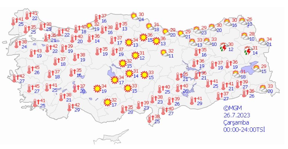 Uzmanlar ise kronik rahatsızlıkları olanları uyarıyor. Günün en sıcak saatlerinde dışarı çıkmamaları yönünde vatandaşları uyaran uzmanlar su içmenin hayati önemini de vurguluyor. Öte yandan Meteoroloji Genel Müdürlüğü (MGM) ise bugün için uyarıda bulundu. Buna göre; İstanbul’da hava sıcaklığı 38 dereceyi bulurken Kırklareli ve Edirne 41 dereceyi görecek. Balıkesir’de termometreler 43 derecede sabitlenirken Antalya’da hava sıcaklığı 42 dereceyi bulacak.