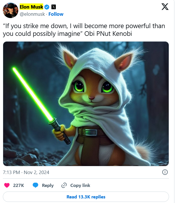 ABD’li milyarder Elon Musk seçimlere kısa süre kalmışken sincabın başına gelenleri iki gün sonra bir sonuca varacak seçimlere bağlamayı ihmal etmedi. Kendini ifade özgürlüğü savaşçısı olarak tanımlayan Musk “Eğer beni devirirsen hayal edebileceğinden çok daha güçlü bir şekilde ayağa kalkarım, -Obi PNut Kenobi” yazarak Star Wars’a gönderme yaptı. Daha sonra da “Hükümet akılsız ve kalpsiz bir ölüm makinesi” dedi. Kısa süre sonra “Başkan Donald Trump sincapları kurtaracak” diye yazdı.