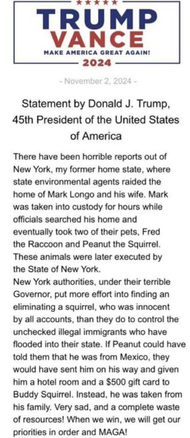 İnterneti karıştıran bir diğer olaysa Trump’ın kampanya logosunu taşıyan bir açıklamanın sosyal medyada dolaşmasıydı. New York’un Demokrat Valisi Kathy Hochul’un suçlandığı bu açıklamada “Eğer Peanut onlara Meksika’dan geldiğini söyleyebilseydi, yoluna gönderirler, bir otel odası tahsis eder, 500 dolar da hediye çeki verirlerdi” diye yazıyordu. Açıklama tam olarak Trump’ın söyleyebileceği bir şey gibi göründüğünden çoğu destekçisi bunun doğru olduğunu düşündü. Ancak daha sonra Trump’ın kampanya ekibi söz konusu açıklamanın sahte olduğunu açıkladı.