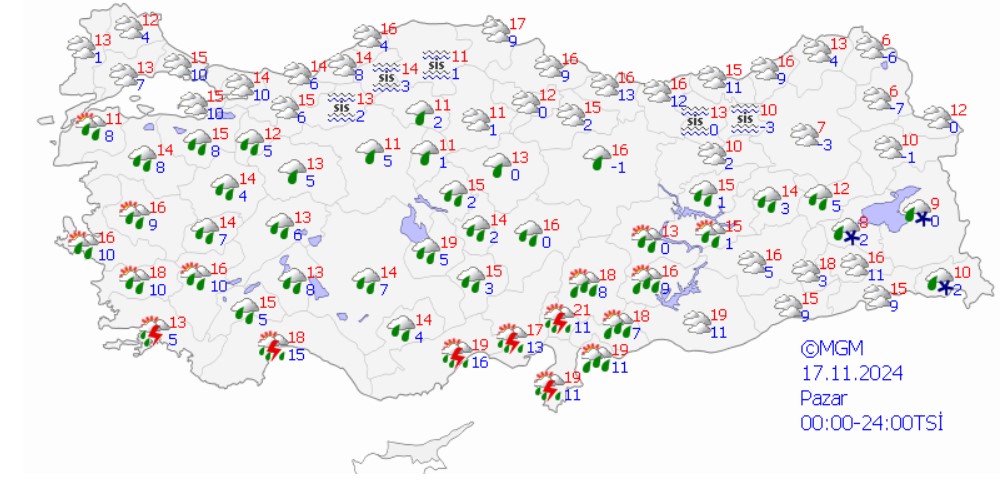 MGM’nin 17 Kasım Pazar günü için hava durumu tahmini.
