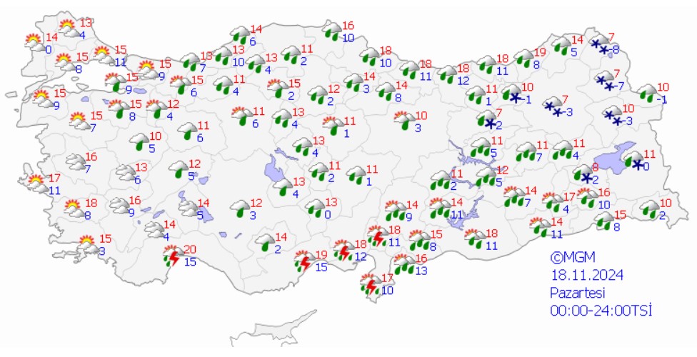 MGM’nin 18 Kasım Pazartesi günü için hava durumu tahmini.