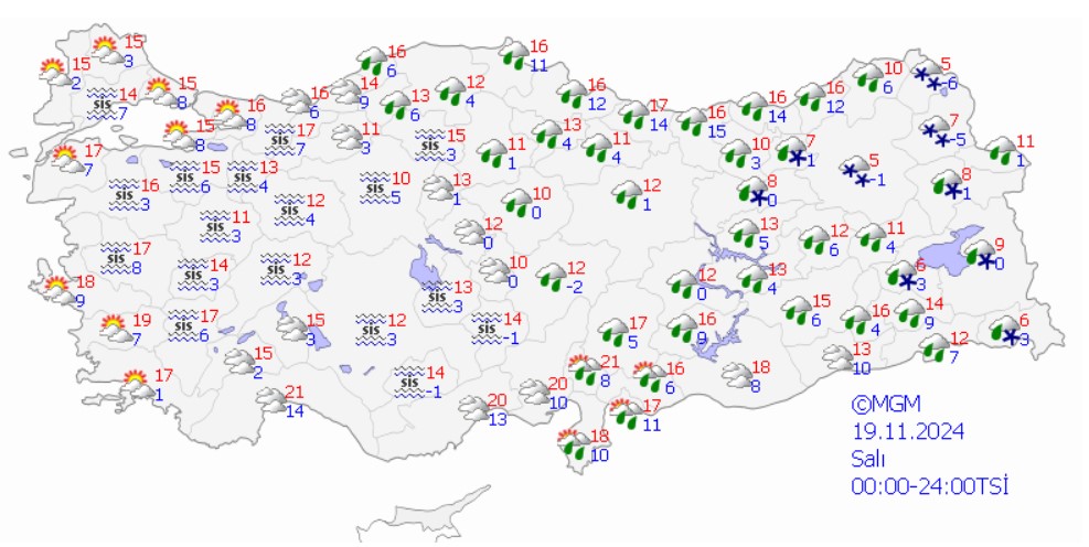 Sıcaklıklar mevsim normallerinde seyrederken 19 Kasım Salı günü Marmara ve Ege bölgelerinde yine güneş yüzünü gösterecek. Ancak bu kez sis daha büyük bir alanda etkili olacak. MGM’nin uyarısına göre Tekirdağ, Balıkesir, Manisa, Denizli, Uşak, Kütahya, Bilecik, Bursa, Sakarya, Eskişehir, Afyonkarahisar, Karaman, Konya, Ankara ve Çankırı’da araç kullanacak şoförlerin dikkatli olması gerekiyor. Yurdun geri kalanındaysa sağanak olacağı tahmin ediliyor.