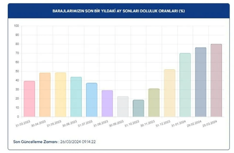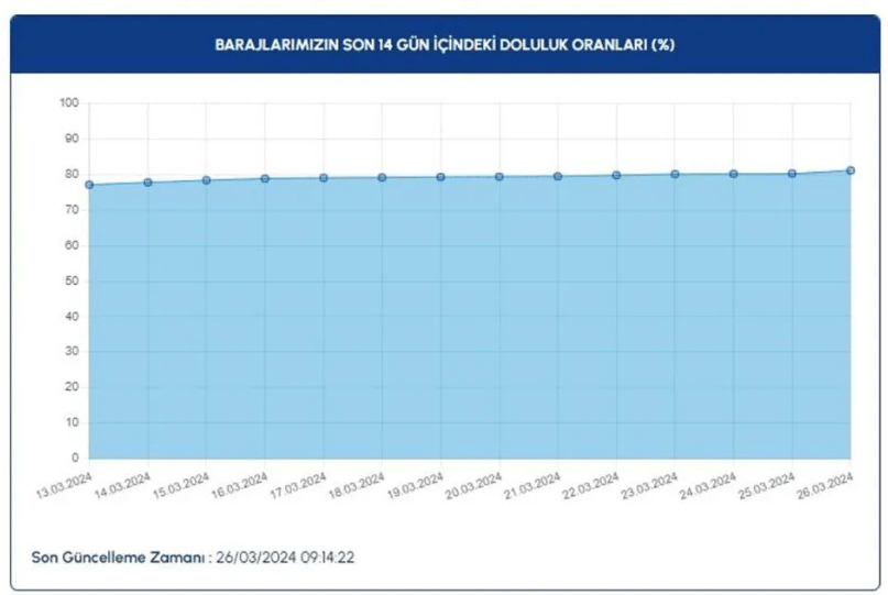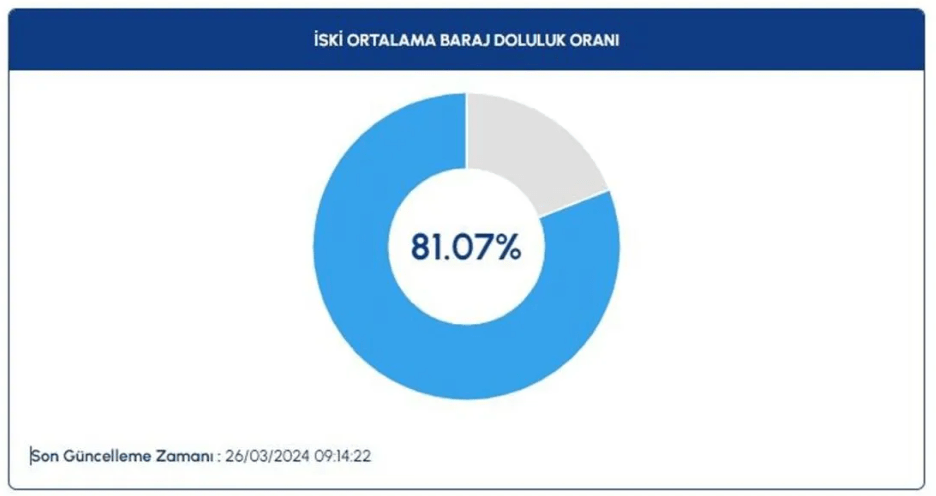 11 Kasım’da yüzde 16,18’e kadar düşen doluluk oranı yüzde 81’i geçti. İSKİ’nin verilerine göre 26 Mart itibariyle İstanbul’da baraj doluluk oranları şöyle: