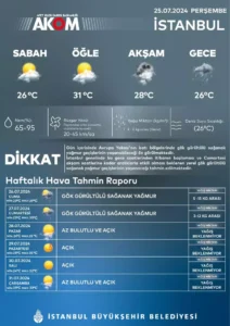 İstanbul için Afet Koordinasyon Merkezi AKOM’un yaptığı uyarıda “Gün içerisinde Avrupa Yakası’nın batı bölgelerinde gök gürültülü sağanak yağmur geçişlerinin yaşanabileceği ön görülmektedir. İstanbul genelinde bu gece saatlerinden itibaren başlaması ve Cumartesi akşam saatlerine kadar aralıklarla etkili olması beklenen gök gürültülü sağanak yağmur geçişlerinin yaşanacağı tahmin edilmektedir” ifadelerine yer verildi.