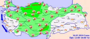 Meteoroloji Genel Müdürlüğü (MGM) tarafından yapılan değerlendirmelere göre ülke genelinin parçalı yer yer çok bulutlu, Marmara, İç Ege, Akdeniz (Antalya kıyıları hariç), İç Anadolu, Karadeniz (Ordu ve Giresun hariç), ile Erzincan, Kars, Ardahan ve Iğdır çevrelerinin yerel sağanak ve gök gürültülü sağanak yağışlı geçeceği tahmin ediliyor.