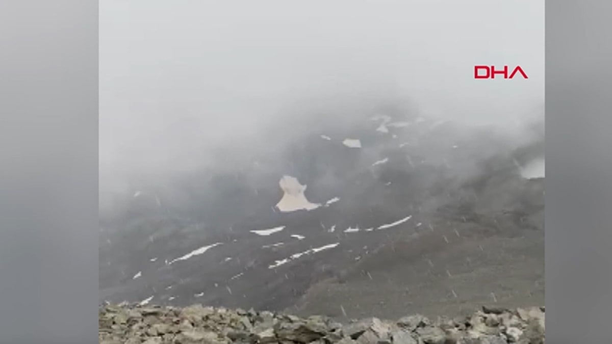 Zirvede dinlenen dağcılar dolunun ardından yağan ilk kar yağışıyla manzaranın keyfini çıkardı. Dağcılar olumsuz hava şartları nedeniyle kısa süre sonra geri döndü.