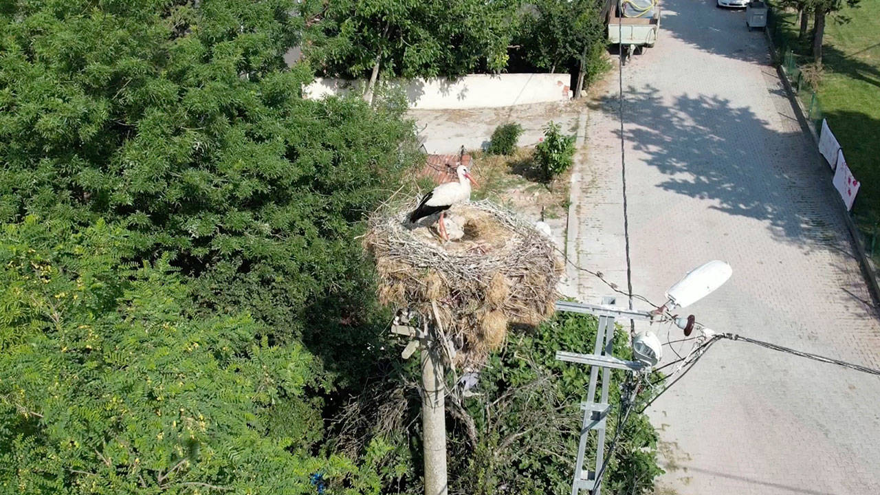 Bu sene ise göç yolculuğunda olan bir leylek Dursunköy Mahallesi’nde mola verdiği esnada üç yavru sahibi oldu. Yavrularını bırakarak göç yolculuğuna devam edemeyen leylek mahallede elektrik direği üzerine kurduğu yuvayla mahalle sakinlerinin maskotu oldu. Maskot leylek dron kamerasıyla görüntülendi.
