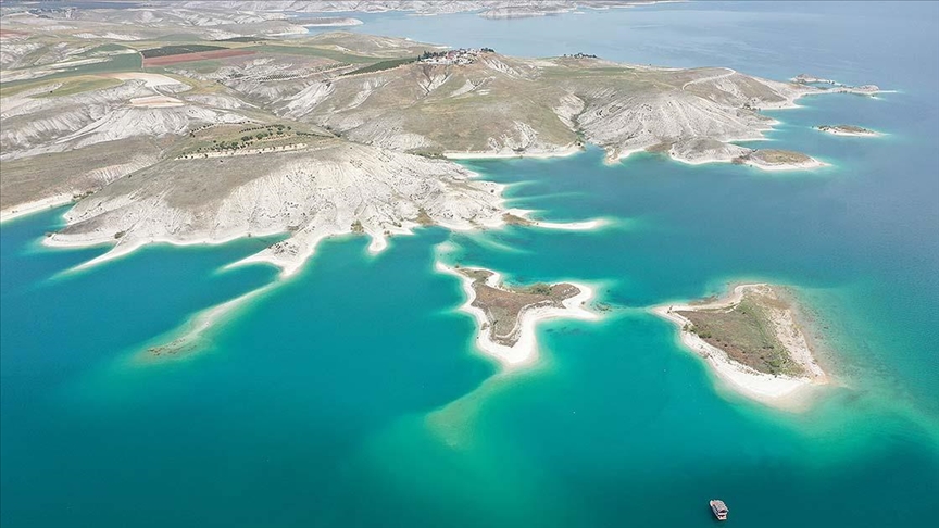 Adıyaman’daki Atatürk Baraj Gölü içinde bulunan yükselti ve adacıklar adeta “Maldivler”i andırıyor. Baraj gölü içinde bulunan yükseltiler havaların ısınması sonucu su seviyesinin düşmesiyle adacıklara dönüşüyor.