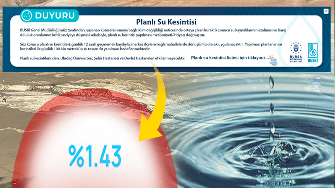 BUSKİ’den su kesintisi duyurusu geldi. Bu duyuruda: “su kaynaklarının azalması ve barajlardaki su seviyesinin kritik seviyeye düşmesi nedeniyle planlı su kesintisi yapılması mecburi olmuştur” denildi. Kesintilerle günde 100 bin metreküp su tasarrufu yapılması planlanıyor.