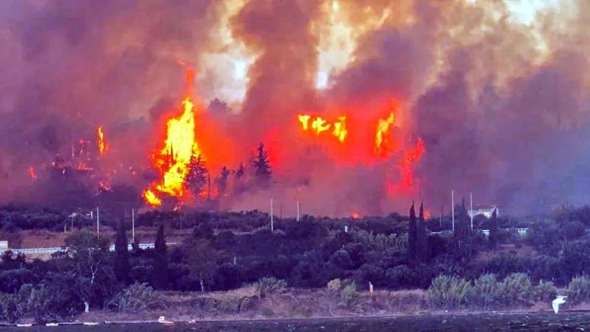 İzmir’in Çeşme ilçesine komşu Sakız Adası (Chios) dün akşam saatlerinde başlayan yangın şiddetli rüzgarın etkisi ile hızla büyüdü.